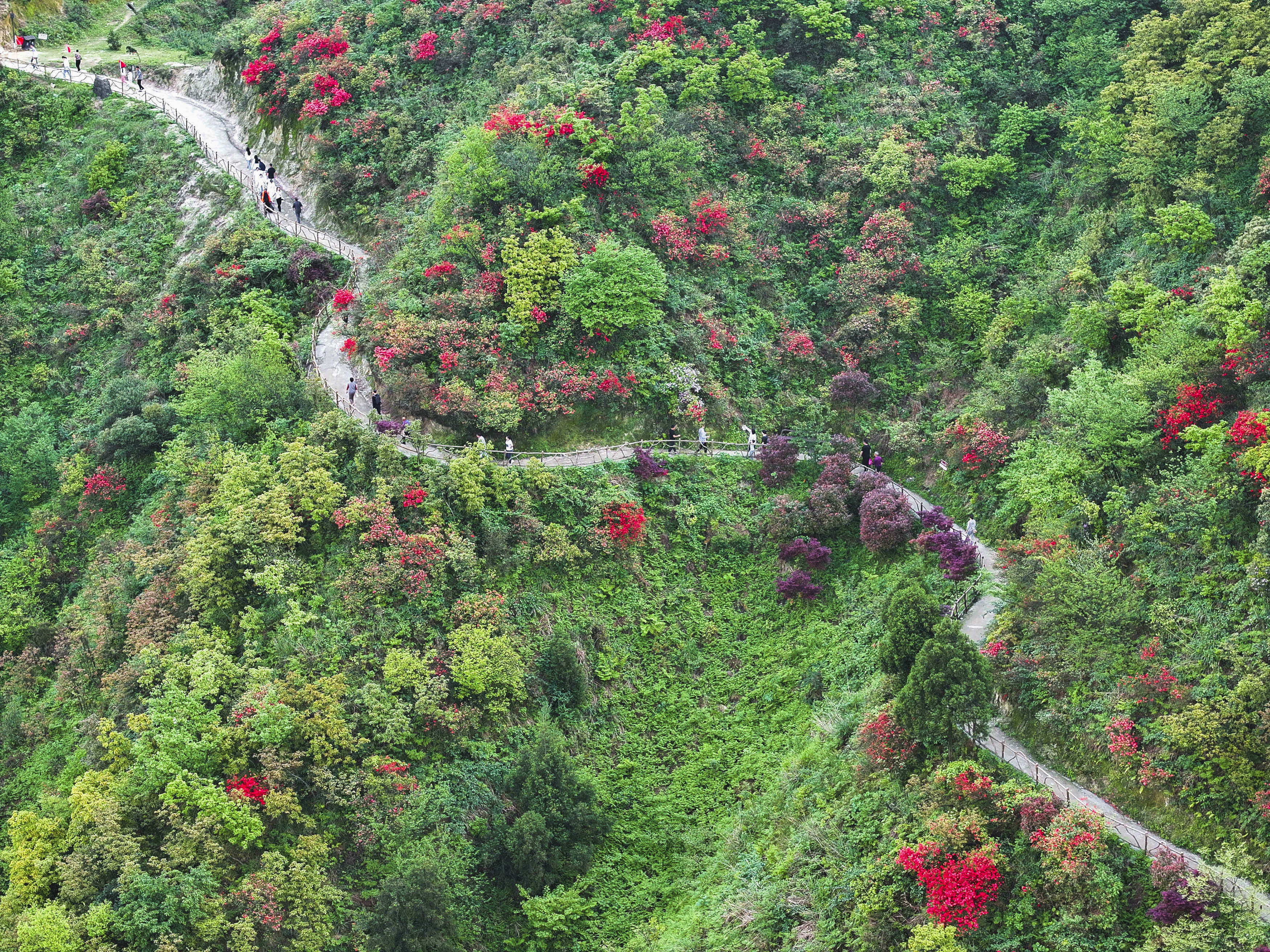 4月18日,游客在湖南省常宁市天堂山国家森林公园赏花游玩(无人机照片)。